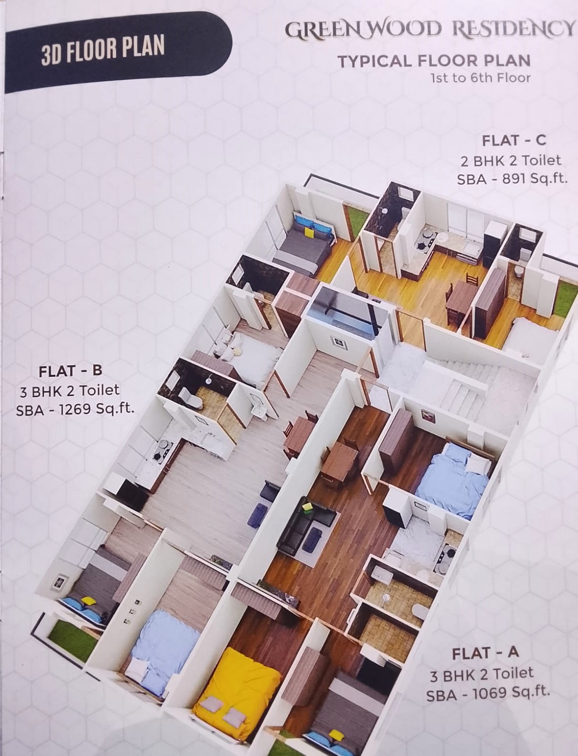 Greenwood Residency is a thoughtfully crafted modern residential project offering premium 2 & 3 BHK apartments that blend comfort, elegance, safety and urban convenience. Built on an earthquake-resistant RCC frame structure with high-quality construction materials, the project ensures long-term durability and a luxurious lifestyle. Each home is designed to maximize natural light, ventilation and privacy, creating a peaceful living environment for families. The interiors feature both-side laminated designer flush doors, branded vitrified tile flooring, premium sanitary ware, anti-skid bathroom flooring, modular electrical switches and high-quality CP fittings. Kitchens come with a granite countertop, stainless-steel sink and glazed tiles for easy maintenance, while balconies with glass railings offer relaxing views of the surroundings.